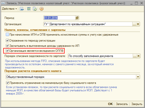 Учитывая тот факт, что не все государственные учреждения являются вкладчиками ОППВ, в прикладном решении «Госсектор: Бухгалтерия государственного учреждения для Казахстана» возможность учета ОППВ настраивается опционально. Для того, чтобы включить возможность учета ОППВ необходимо установить признак «Организация является вкладчиком ОППВ» в учетной политике по налоговому учету (меню «Учреждение» — «Учетная политика» — «Учетная политика (налоговый учет)»).