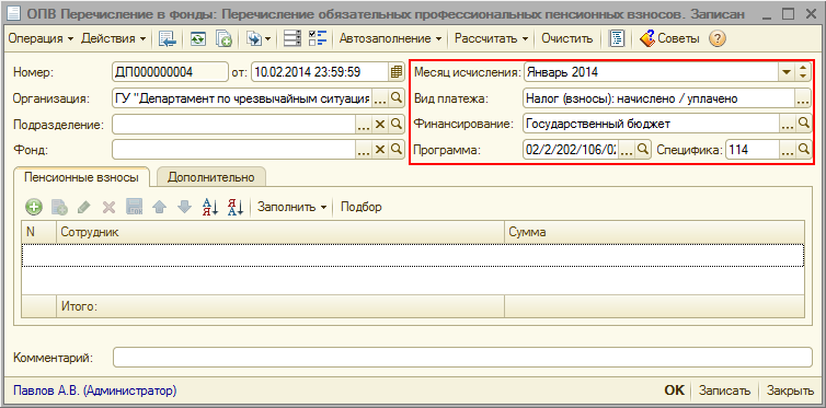 Перечисление ОППВ оформляется документом «ОПВ перечисление в фонды» (меню «Зарплата» — «Учет пенсионных взносов» — «ОПВ Перечисление в фонды») с видом операции «Перечисление обязательных профессиональных пенсионных взносов». В шапке документа нужно указать месяц исчисления, вид платежа и бюджетную аналитику: источник финансирования, бюджетную программу и специфику.