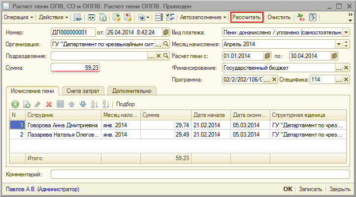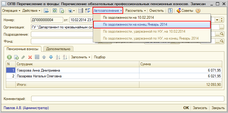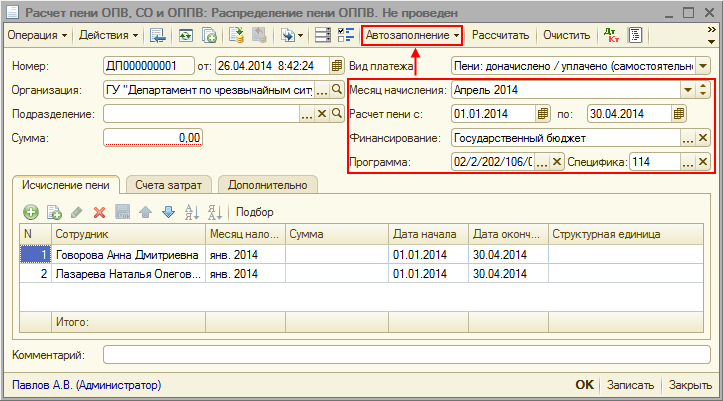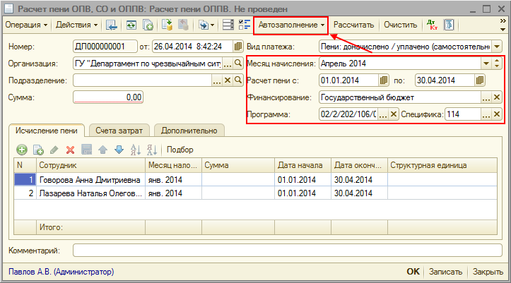 Первая операция, «Расчет пени ОППВ», предназначена для автоматического расчета пени в зависимости от срока просрочки за несвоевременное перечисление ОППВ. Для заполнения табличной части документа можно воспользоваться механизмом автозаполнения. В этом случае автоматически будет сформирован список работников, по которым имеется просроченная задолженность по ОППВ.