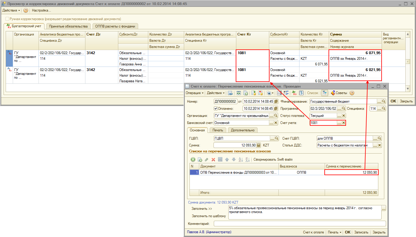 Для регистрации факта перечисления ОППВ на основании документа «ОПВ перечисление в фонды» можно ввести документ «Счет к оплате». Счет дебета в проводках документов автоматически заполняется из реквизита «Счет учета (БУ)» справочника «Налоги, сборы, отчисления» для элемента «Обязательные профессиональные пенсионные взносы». При незаполненном счете устанавливается счет 3142 «Краткосрочная кредиторская задолженность по пенсионным взносам в накопительные пенсионные фонды».