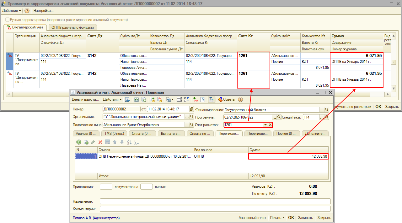 В случае перечисления ОППВ через подотчетное лицо на основании документа «ОПВ перечисление в фонды» для регистрации факта перечисления ОППВ можно ввести документ «Авансовый отчет».