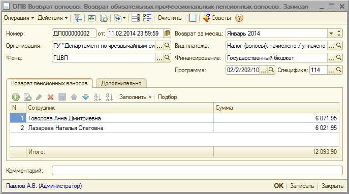 Возврат ОППВ оформляется документом «ОПВ возврат взносов» с видом операции «Возврат обязательных профессиональных пенсионных взносов» (меню «Зарплата» — «Учет пенсионных взносов»). В шапке документа нужно указать месяц возврата и бюджетную аналитику: источник финансирования, бюджетную программу и специфику. Табличная часть заполняется вручную либо путем ввода на основании документа «ОПВ Перечисление в фонды». Во втором случае все данные заполнятся автоматически.