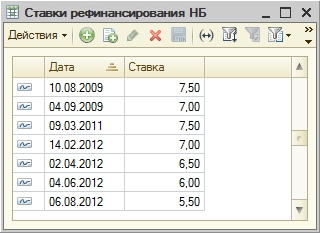 В регистре сведений «Ставки рефинансирования НБ» (меню «Зарплата» — «Учет пени ОПВ и СО» — «Ставки рефинансирования НБ») указываются значения ставки рефинансирования Национального Банка РК, используемые при расчете пени за задержку перечисления заработной платы, обязательных пенсионных взносов и социальных отчислений. Как правило, этот регистр сведений заполняется автоматически при первоначальном заполнении информационной базы или при ее обновлении, и ручная корректировка этого регистра не требуется.