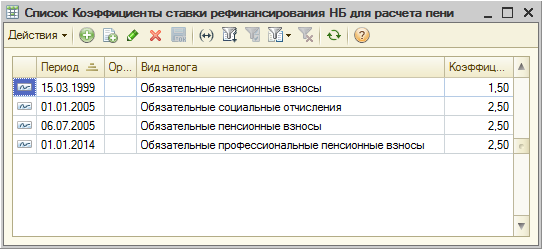 Значения коэффициентов, применяемых к ставке рефинансирования для исчисления пени, заполняются в регистре сведений «Коэффициенты ставки рефинансирования НБ для расчета пени» (меню «Зарплата» — «Учет пени ОПВ и СО» — «Коэффициенты ставки рефинансирования НБ для расчета пени»). Как правило, регистр сведений заполняется автоматически при первоначальном заполнении информационной базы или при ее обновлении, и изменение этого регистра требуется.