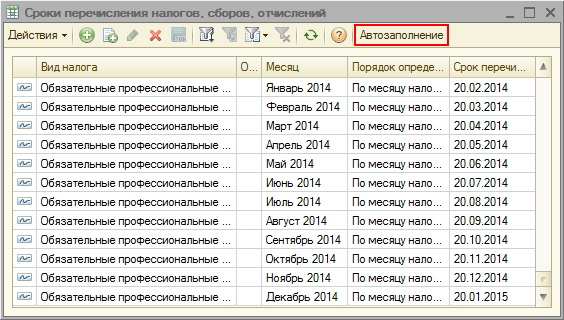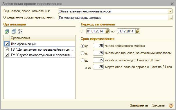 Для указания сроков перечисления взносов и отчислений предназначен специализированный регистр сведений «Сроки перечисления налогов, сборов, отчислений» (меню «Зарплата» — «Учет пени ОПВ и СО» — «Сроки перечисления налогов, сборов, отчислений»). Для корректного расчета пени регистр должен быть заполнен на каждый месяц.
