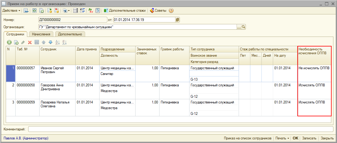 После этого необходимо определить тех сотрудников, за которых должны вноситься ОППВ. Сделать это можно в документах кадрового учета. В документах «Прием на работу в организацию» и «Кадровое перемещение организаций» признак необходимости исчисления ОППВ для сотрудника устанавливается путем выбора значения из предложенного списка в колонке «Необходимость исчисления ОППВ».
