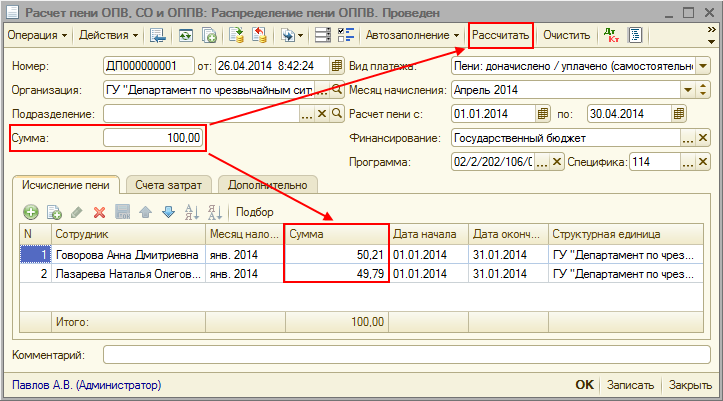 Кнопка «Рассчитать» позволяет автоматически распределить указанную сумму для списка сотрудников.