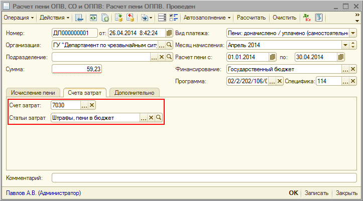 Вне зависимости от выбранной операции для корректного отражения начисленной пени необходимо указать счет затрат на закладке «Счета затрат».