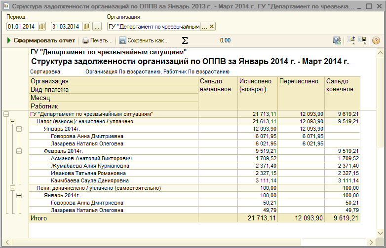 Для анализа данных по ОППВ в конфигурации «Госсектор: Бухгалтерия государственного учреждения для Казахстана» есть отчет «Структура задолженности организаций по ОППВ» («Зарплата» — «Учет пенсионных взносов» — «Структура задолженности организаций по ОППВ»).