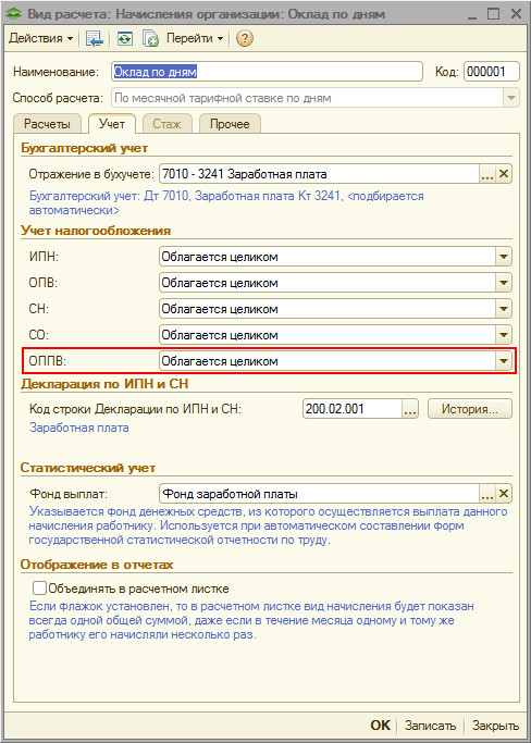 Кроме того, для облагаемых ОППВ видов начислений необходимо указать вид учета налогообложения по аналогии с другими налогами и взносами. Это можно сделать на закладке «Учет» карточки вида расчета (меню «Зарплата» — «Настройка начислений» — «Виды начислений»).