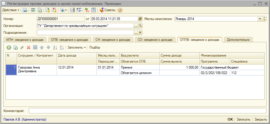 После того, как налогообложение начислений сотрудников ОППВ настроено, необходимо зарегистрировать доходы сотрудников. Сведения о доходах, с которых необходимо исчислять ОППВ, формируются аналогично сведениям о доходах по другим видам налогов.