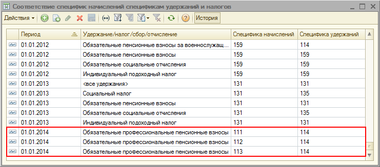 Как и у прочих видов отчислений, для профессиональных взносов предназначена отдельная специфика 114 «Дополнительно установленные обязательные пенсионные взносы и обязательные профессиональные пенсионные взносы». Настроить специфику учета для данного отчисления необходимо в регистре сведений «Соответствие специфик начислений спецификам удержаний и налогов» (меню «Зарплата» — «Настройка удержаний» — «Соответствие специфик начислений спецификам удержаний и налогов»). В регистр необходимо для каждой использующейся специфики начислений добавить строку с видом налога «Обязательные профессиональные пенсионные взносы» и нужной спецификой удержания.