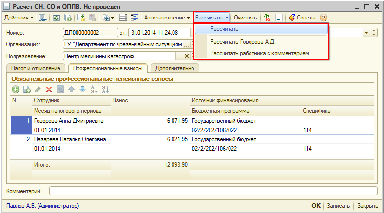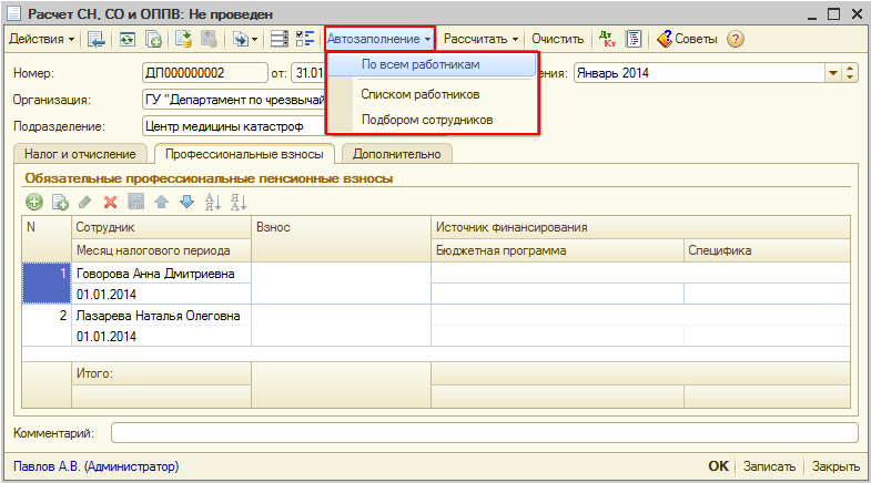 Расчет ОППВ производится документом «Расчет СН, СО и ОППВ». Список сотрудников и данные по результатам расчетов ОППВ содержатся в отдельной табличной части, расположенной на закладке «Профессиональные взносы». Заполнить список сотрудников, у которых в расчетном периоде были зарегистрированы облагаемые ОППВ доходы, можно автоматически, воспользовавшись для этого кнопками подменю «Автозаполнение».