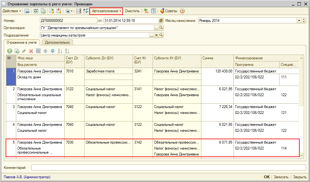 Рассчитанные суммы ОППВ нужно отразить в бухгалтерском учете. Отражение исчисленных ОППВ будет производится документом «Отражение зарплаты в регл. учете» (меню «Зарплата» - «Отражение зарплаты в регламентированном учете»). При нажатии на кнопку «Автозаполнение» производится автоматическое заполнение документа. Счетом дебета для отражения ОППВ является счет 7030 «Расходы на дополнительно установленные пенсионные взносы». Счет кредита устанавливается в соответствии с реквизитом «Счет учета (БУ)» справочника «Налоги, сборы, отчисления» для элемента «Обязательные профессиональные пенсионные взносы». При незаполненном счете подставляется счет 3142 «Краткосрочная кредиторская задолженность по пенсионным взносам в накопительные пенсионные фонды».