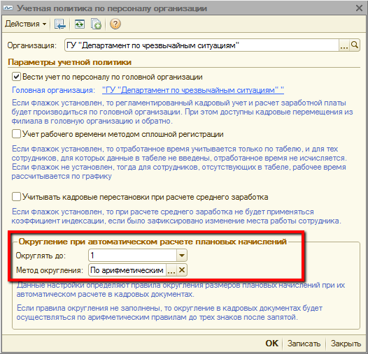 Перед выполнением обработок необходимо определить правила округления размеров плановых начислений при их автоматическом расчете в кадровых документах. Данные правила задаются в регистре сведений «Учетная политика по персоналу организации» (меню «Учреждение» ― «Учетная политика»).