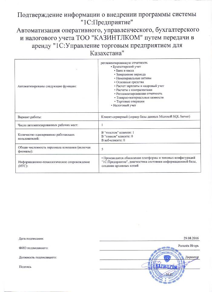 | Внедренное типовое решение: | 1С:Управление торговым предприятием для Казахстана |
