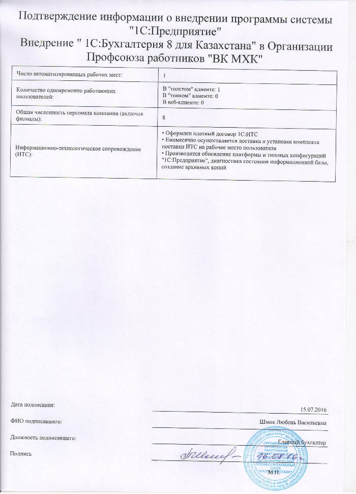| Внедренное типовое решение: | 1С:Бухгалтерия 8 для Казахстан |