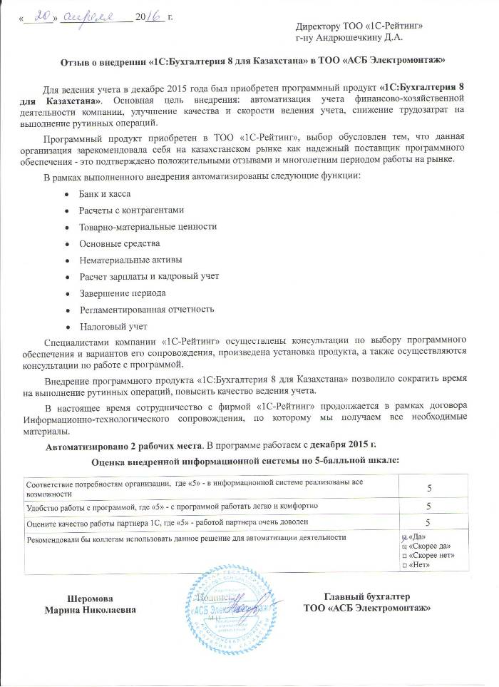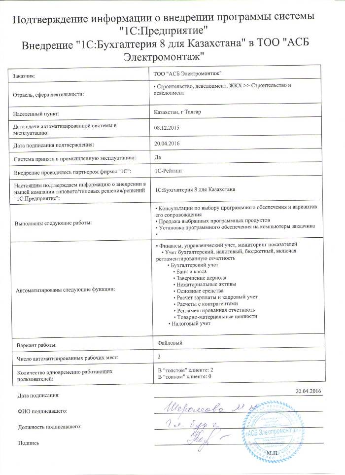 | Внедренное типовое решение: | 1С:Бухгалтерия 8 для Казахстан |