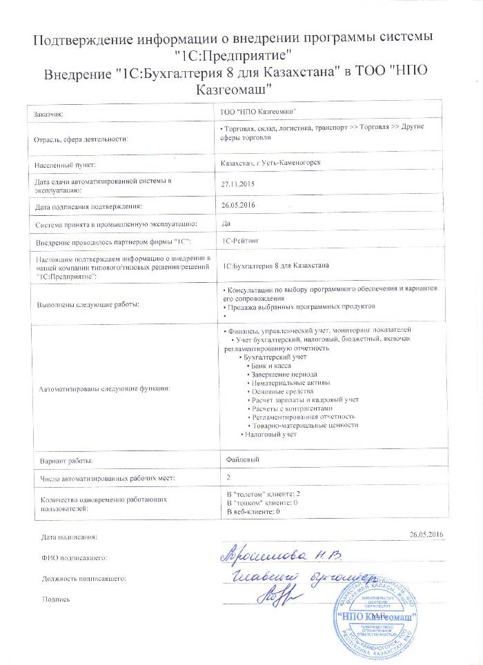 | Внедренное типовое решение: | 1С:Бухгалтерия 8 для Казахстана |