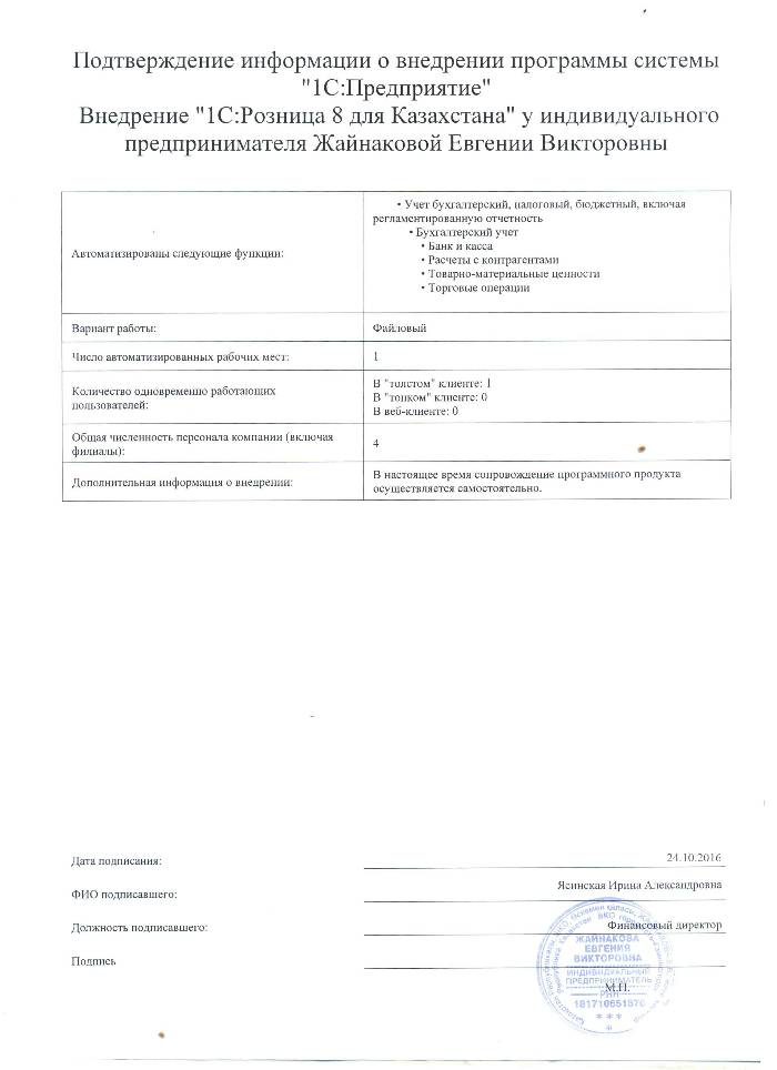 | Внедренное типовое решение: | 1С:Розница 8 для Казахстан |
