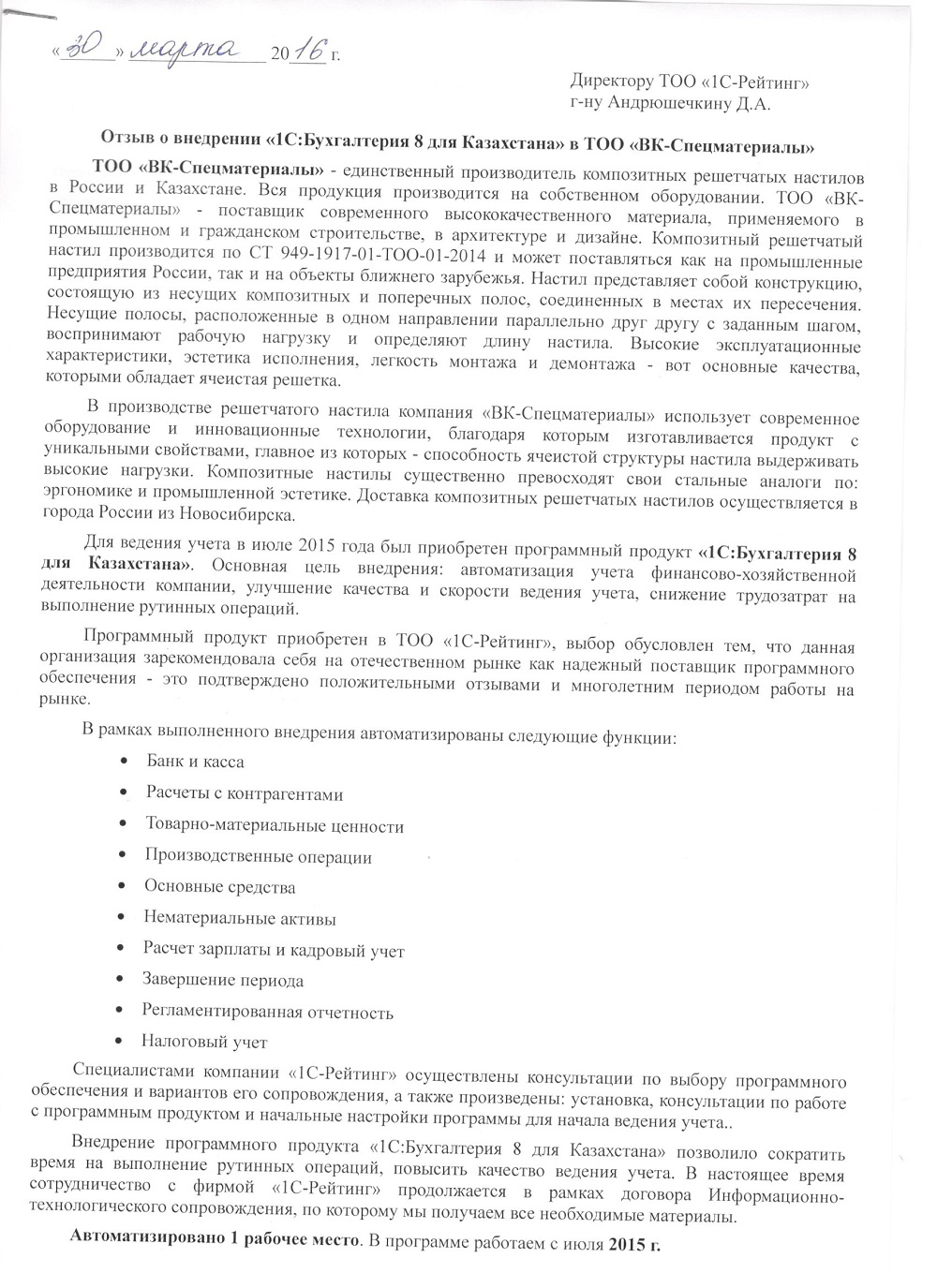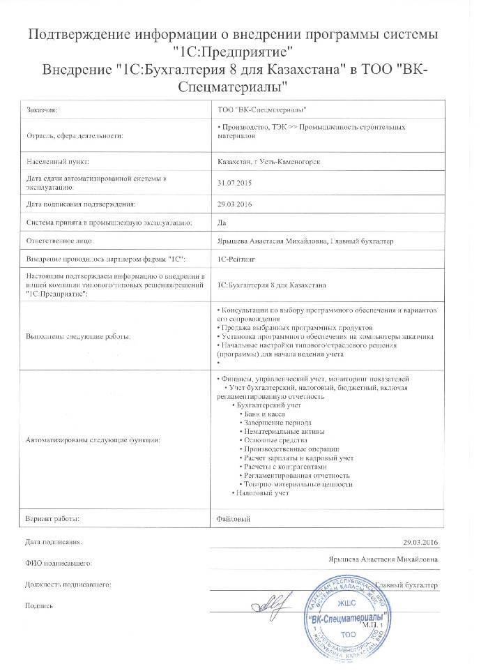 | Внедренное типовое решение: | 1С:Бухгалтерия 8 для Казахстана |
