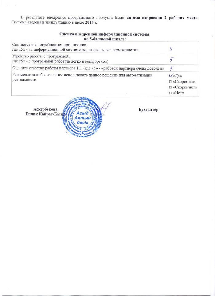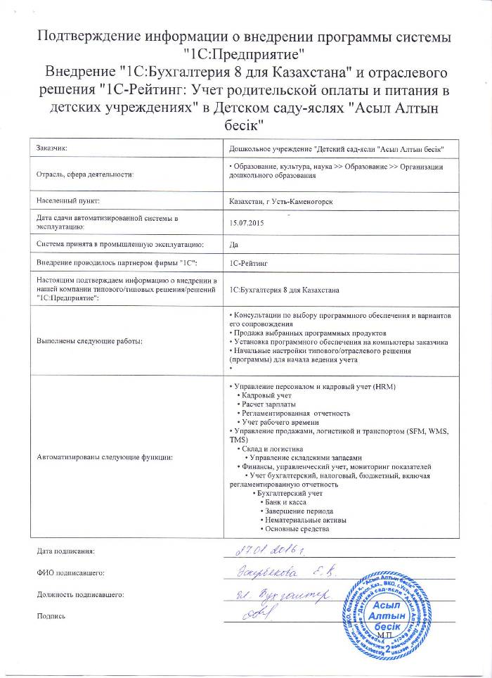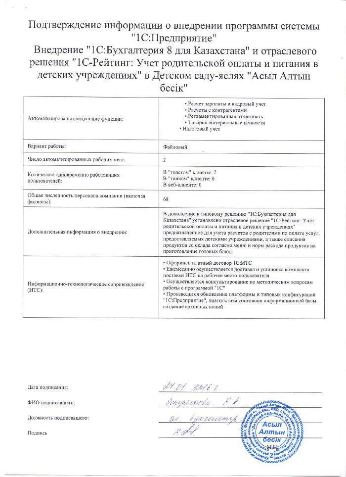 В дополнение к типовому решению «1С:Бухгалтерия 8 для Казахстана» установлено отраслевое решение «1С-Рейтинг: Учет родительской оплаты и питания в детских учреждениях» предназначенное для учета расчетов с родителями по оплате услуг, предоставляемых детскими учреждениями, а также списания продуктов со склада согласно меню и норм расхода продуктов на приготовление готовых блюд.