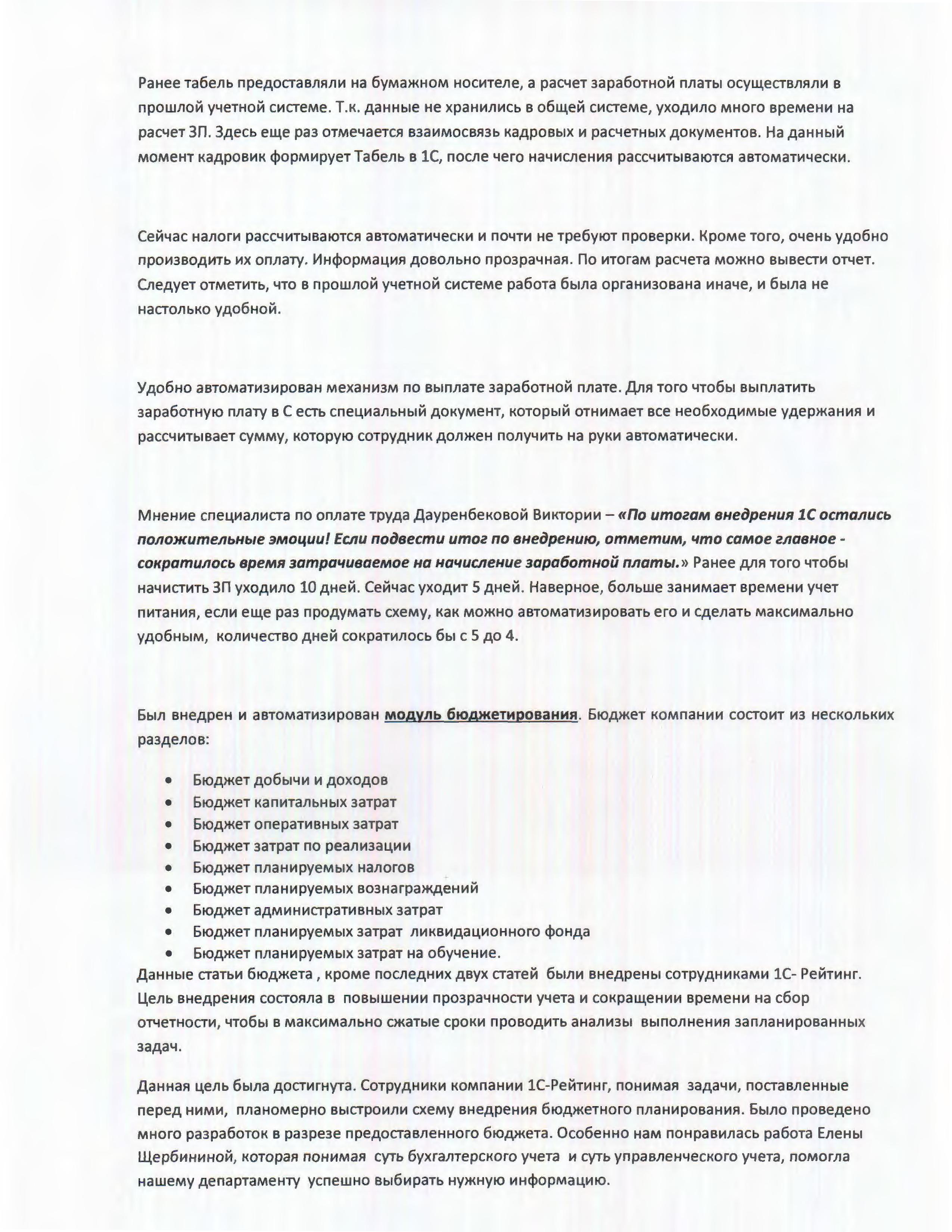 Мнение специалиста по оплате труда Дауренбековой Виктории: «По итогам внедрения 1С остались положительные эмоции! Если подвести итог по внедрению, отметим, что самое главное - сократилось время затрачиваемое на начисление заработной платы. Ранее для того чтобы начистить ЗП уходило 10 дней. Сейчас уходит 5 дней. Наверное, больше занимает времени учет питания, если еще раз продумать схему, как можно автоматизировать его и сделать максимально удобным, количество дней сократилось бы с 5 до 4».