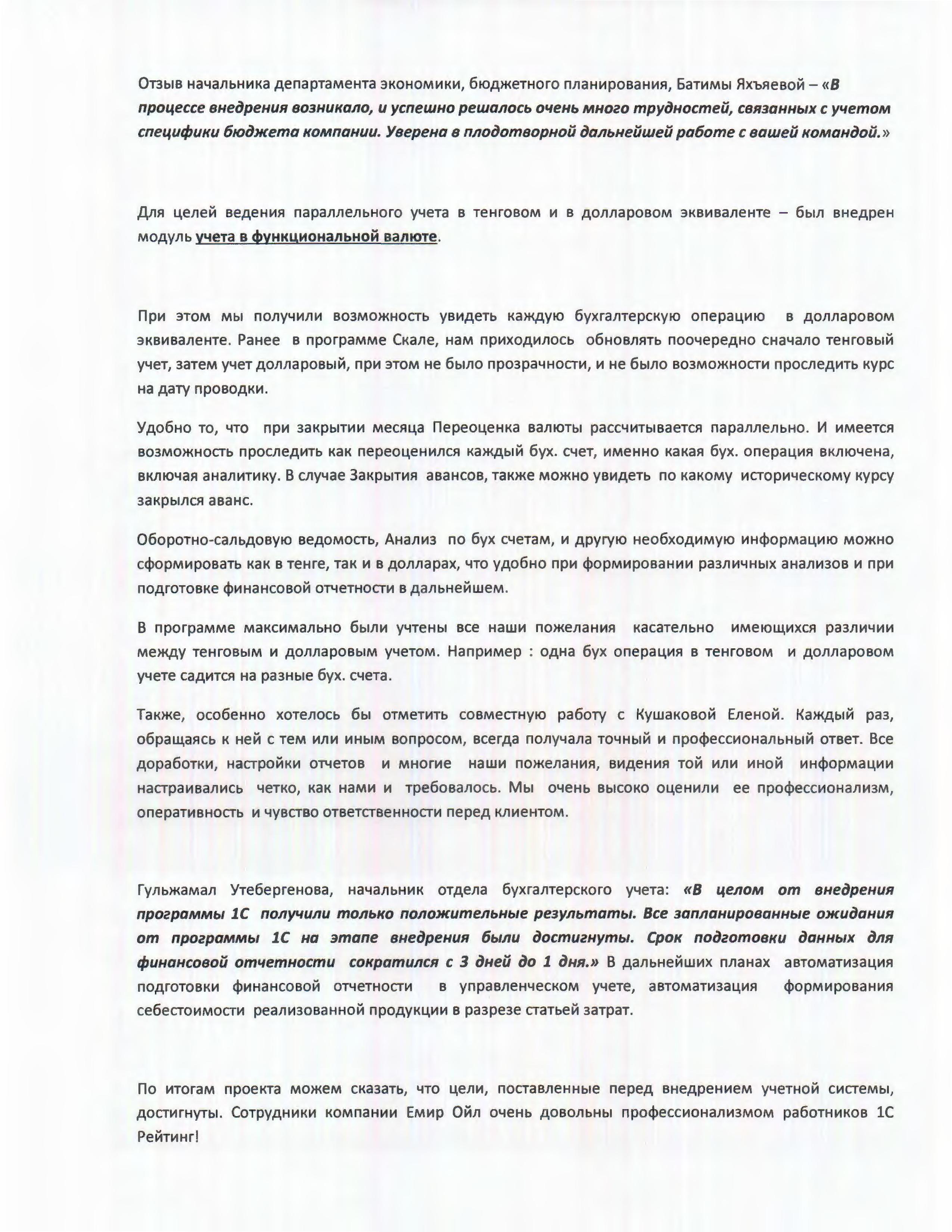 Отзыв начальника департамента экономики, бюджетного планирования, Батимы Яхъяевой: «В процессе внедрения возникало и успешно решалось очень много трудностей, связанных с учетом специфики бюджета компании. Уверена в плодотворной дальнейшей работе с вашей командой».
