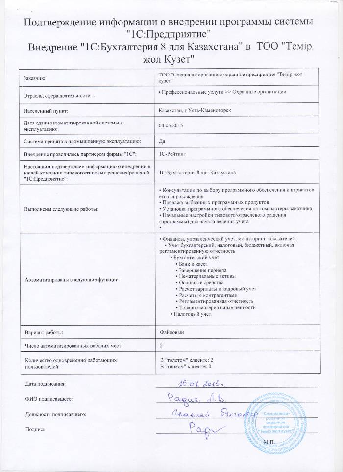 | Внедренное типовое решение: | 1С:Бухгалтерия 8 для Казахстана |