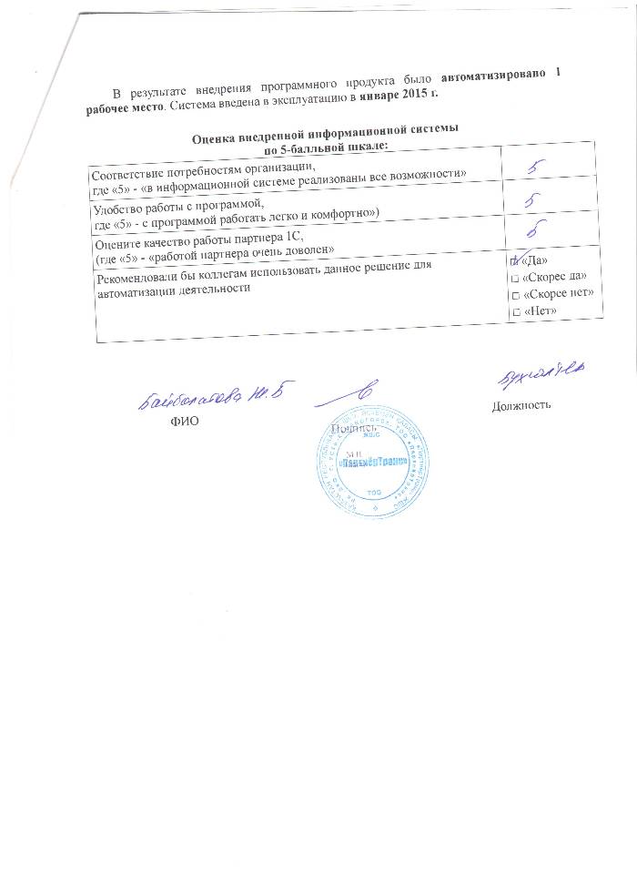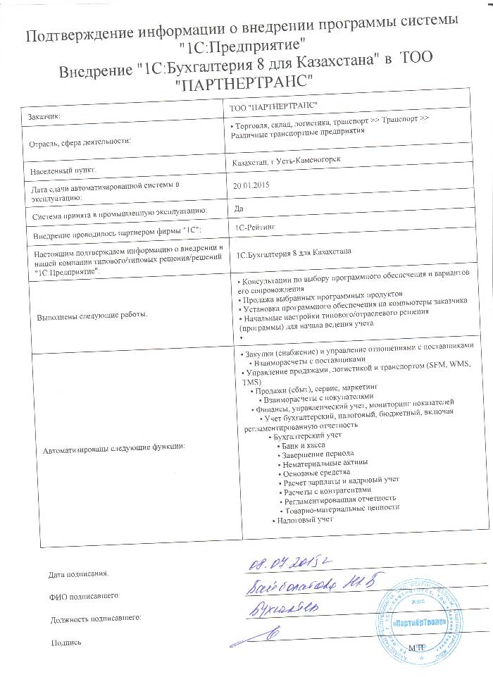 | Внедренное типовое решение: | 1С:Бухгалтерия 8 для Казахстана |