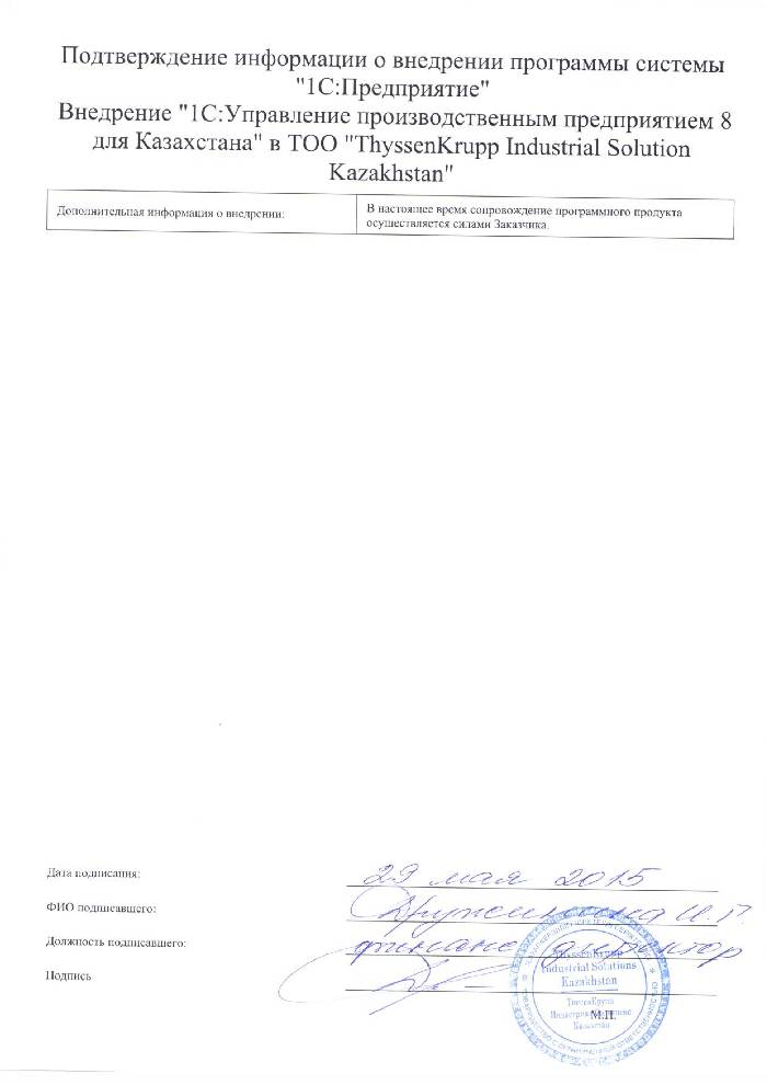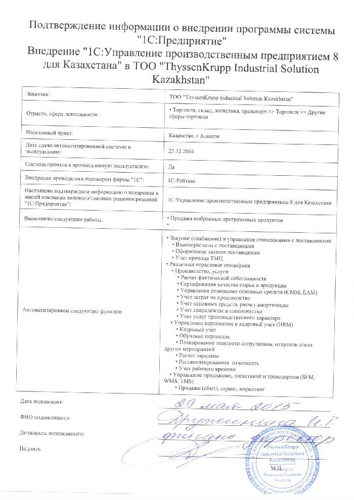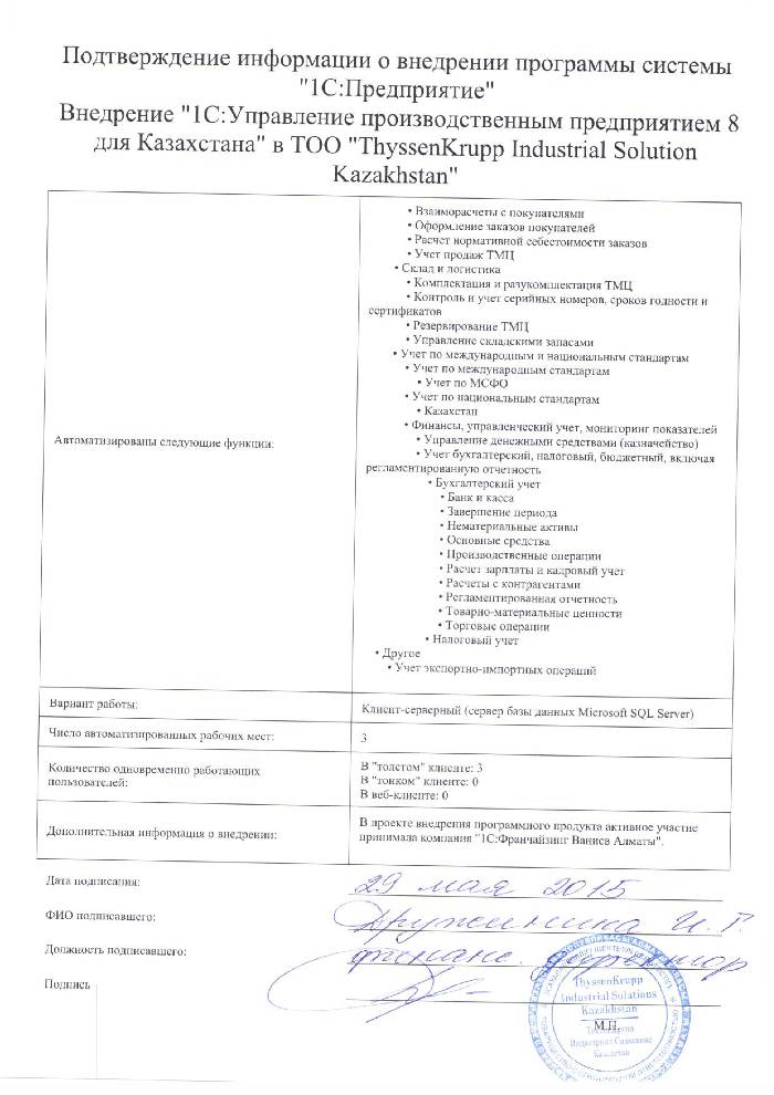 В декабре 2013 года перед руководством компании «ThyssenKrupp Industrial Solutions Kazakhstan» встал вопрос о внедрении комплексной информационной системы на предприятие. В результате анализа программных продуктов предназначенных для комплексной автоматизации производственных предприятий было принято решение сделать выбор в пользу «1С:Управление производственным предприятием 8 для Казахстана». По итогу проведенного нами мониторинга рынка компаний, специализирующихся на комплексных решениях 1С для поставки программного продукта была выбрана компания «1С-Рейтинг».