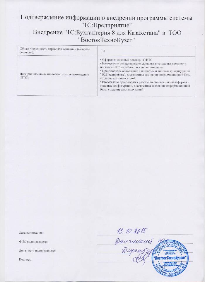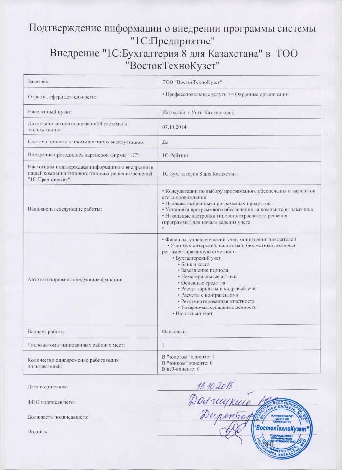 | Внедренное типовое решение: | 1С:Бухгалтерия 8 для Казахстана |