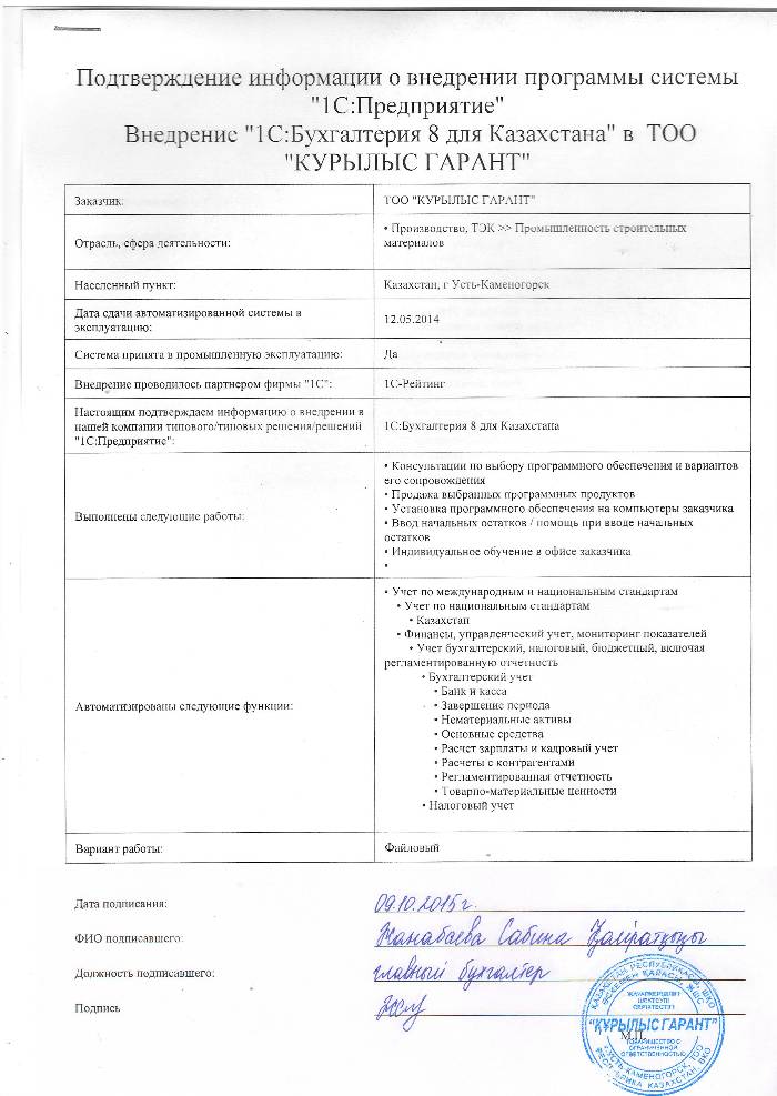 | Внедренное типовое решение: | 1С:Бухгалтерия 8 для Казахстана |