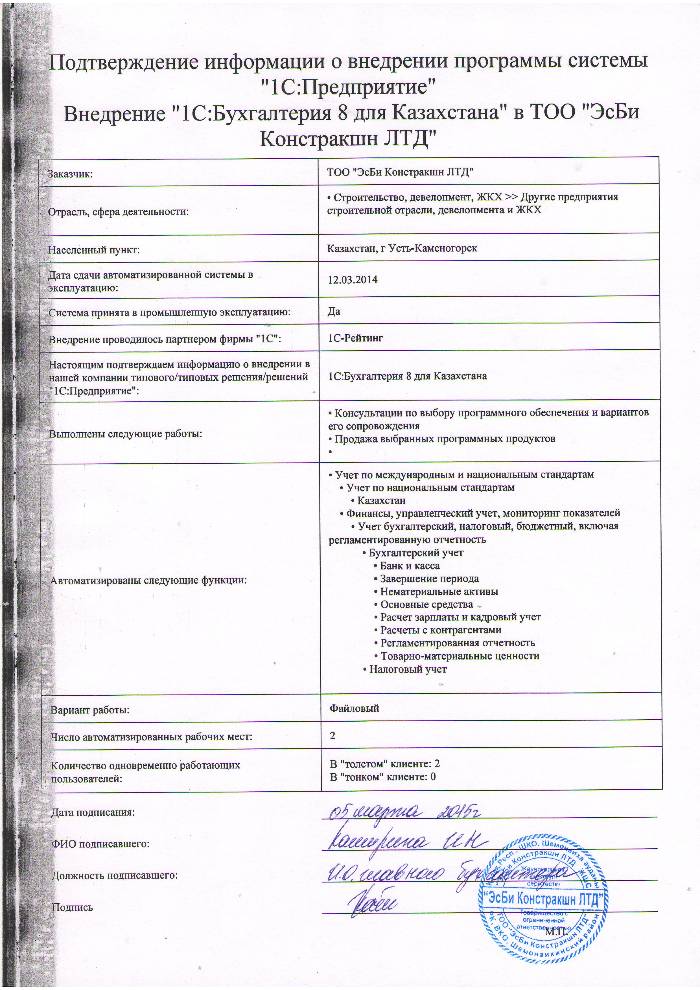 | Внедренное типовое решение: | 1С:Бухгалтерия 8 для Казахстана |