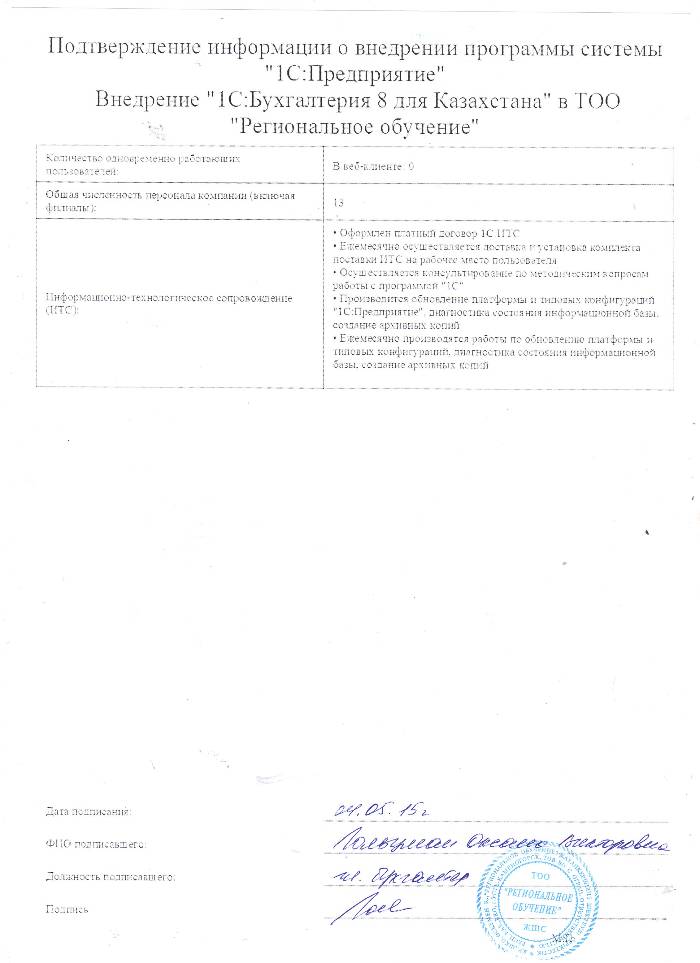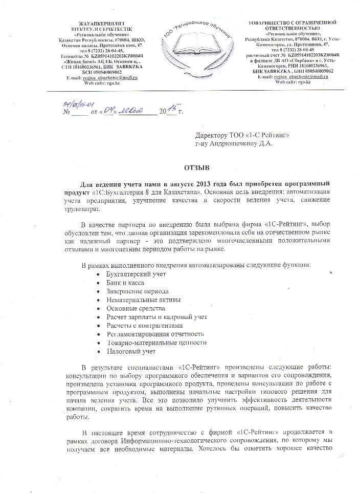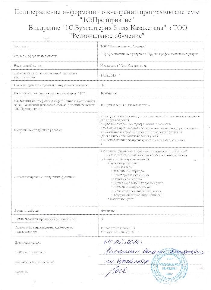 Внедрение 1С:Бухгалтерия 8 для Казахстана в ТОО Региональное обучение