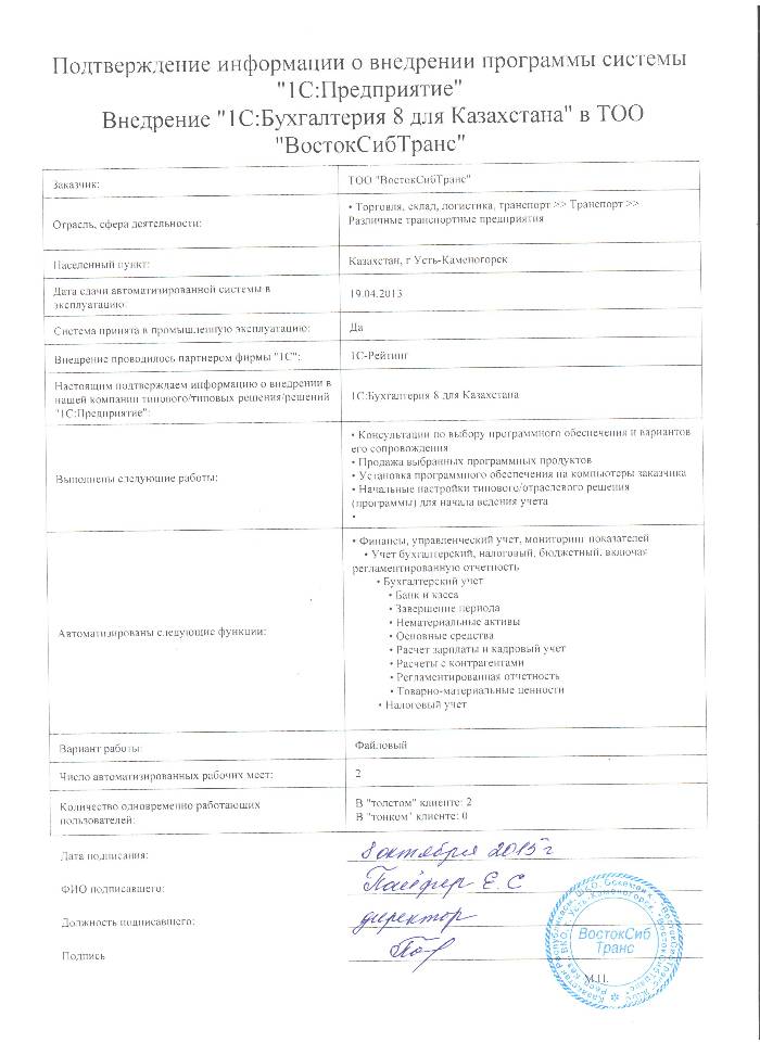 | Внедренное типовое решение: | 1С:Бухгалтерия 8 для Казахстана |