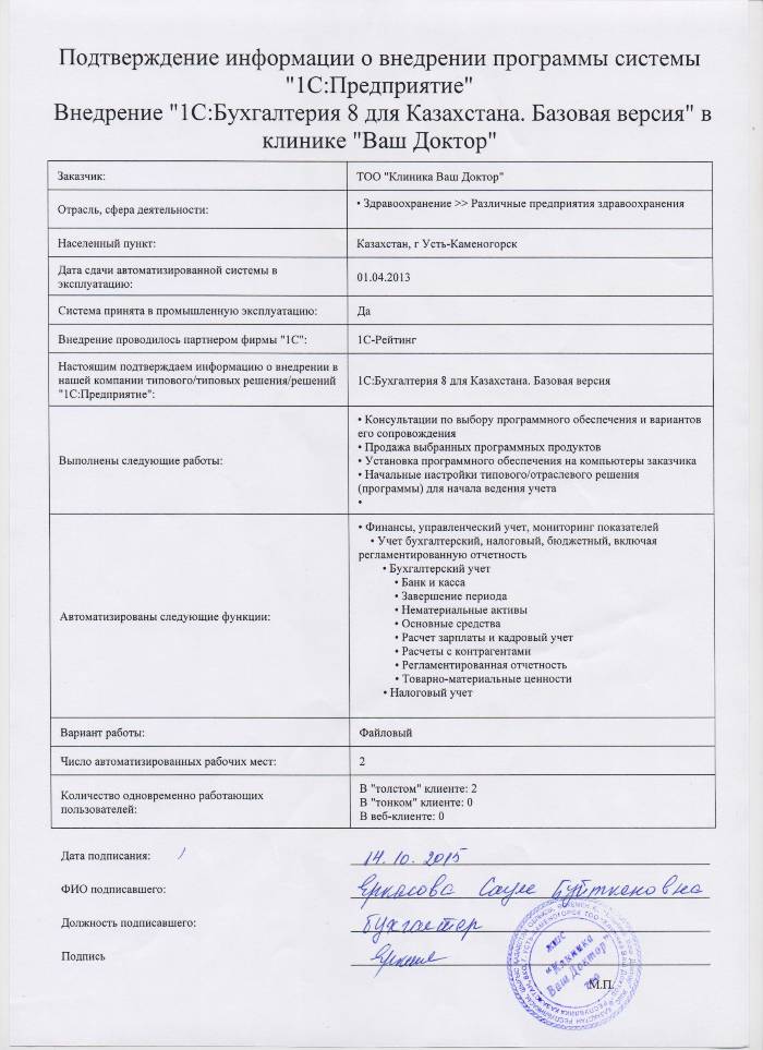 | Внедренное типовое решение: | 1С:Бухгалтерия 8 для Казахстана. Базовая версия |