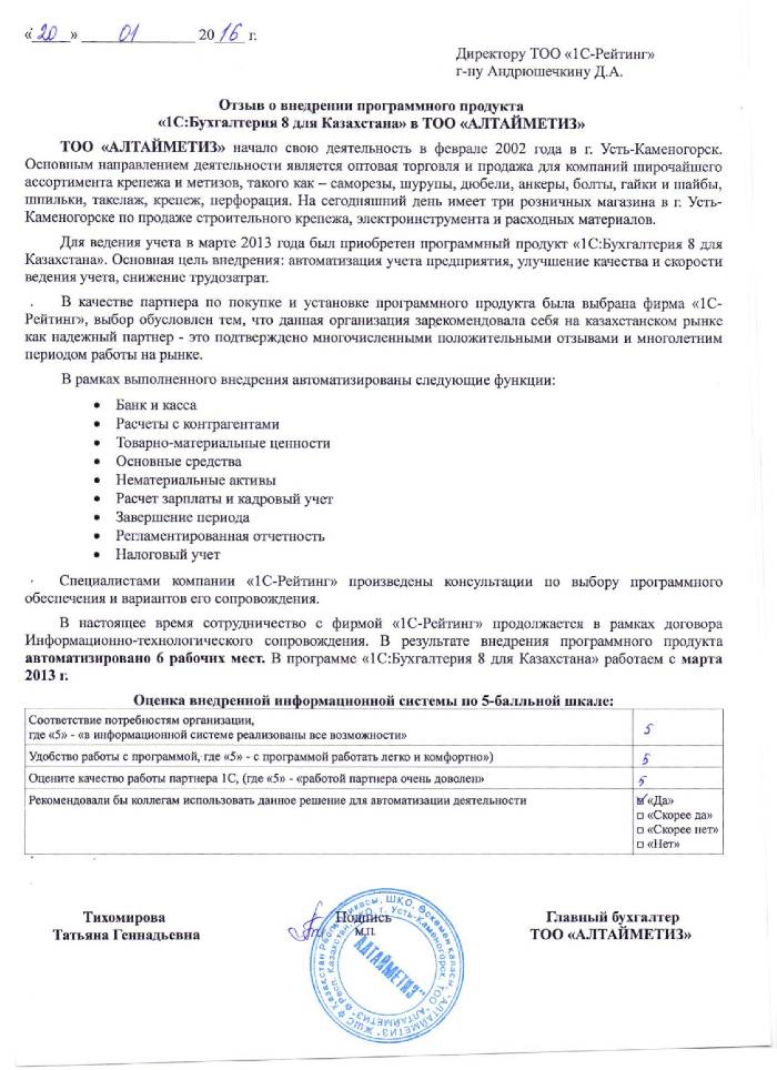 | Внедренное типовое решение: | 1С:Бухгалтерия 8 для Казахстана |