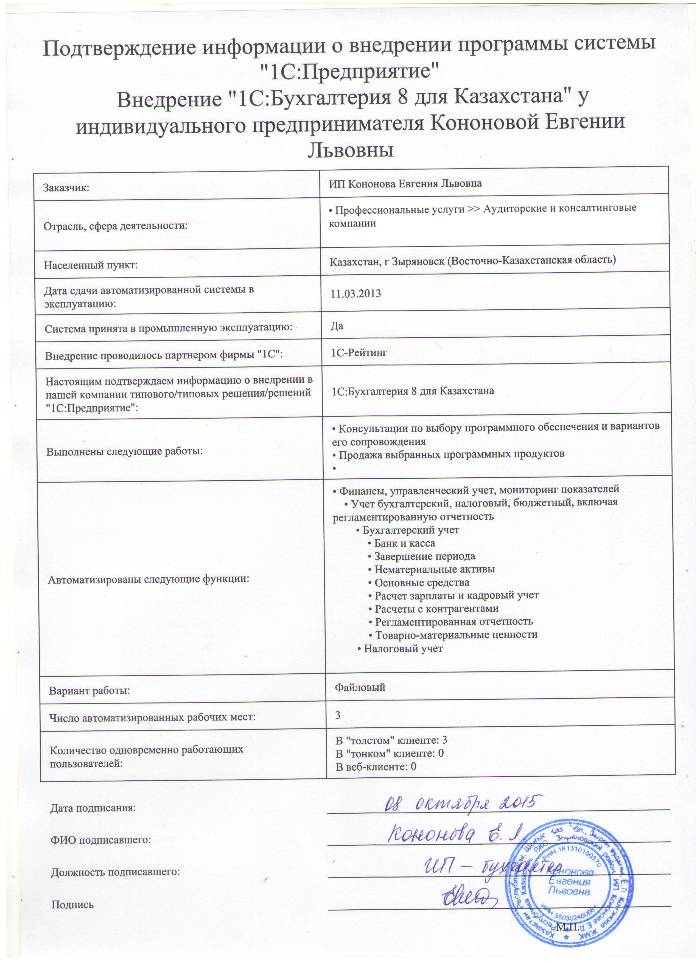 | Внедренное типовое решение: | 1С:Бухгалтерия 8 для Казахстана |