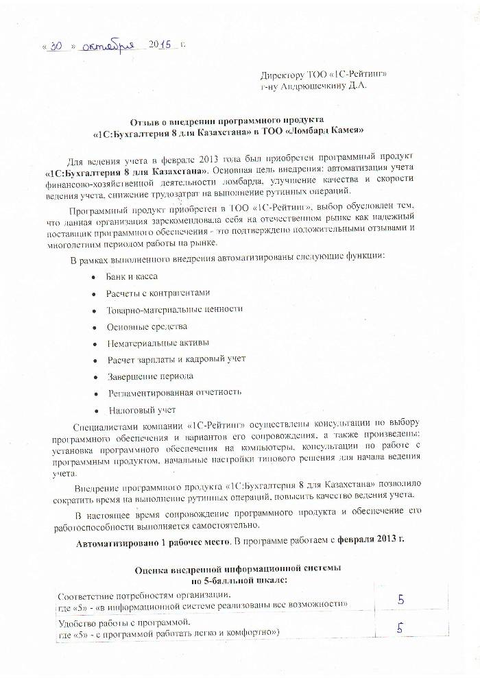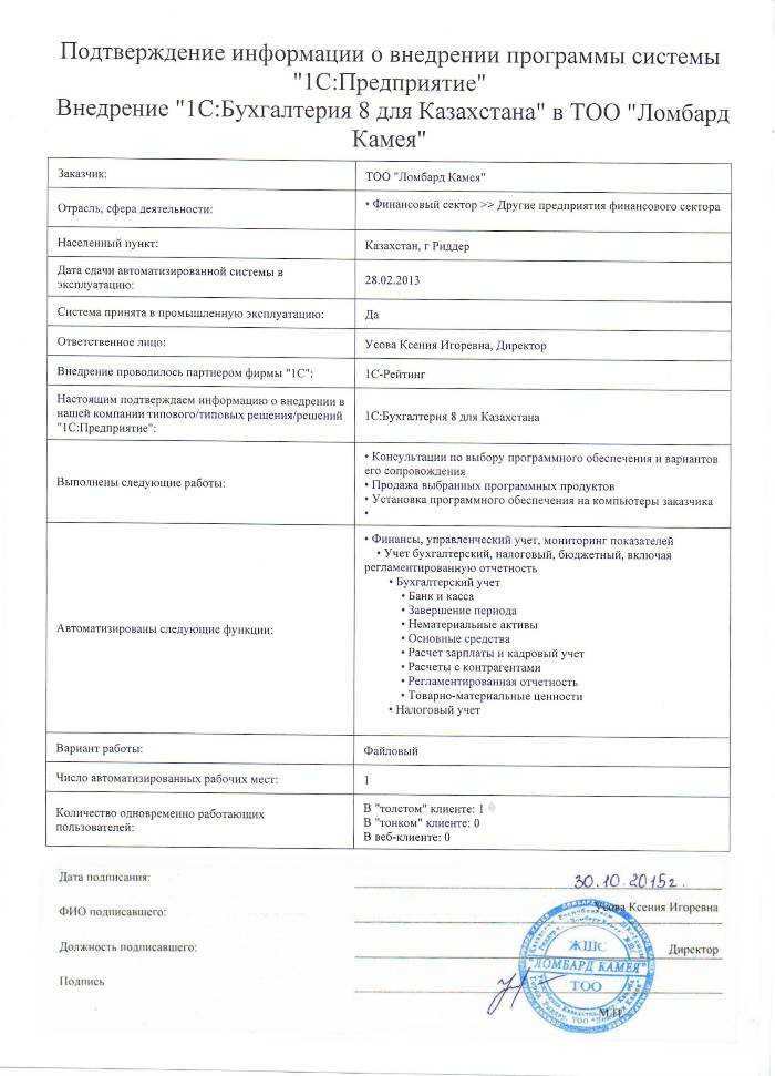 | Внедренное типовое решение: | 1С:Бухгалтерия 8 для Казахстана |