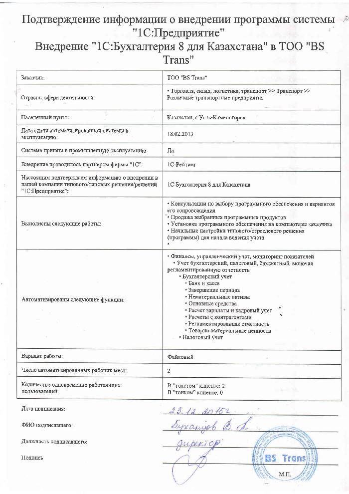 | Внедренное типовое решение: | 1С:Бухгалтерия 8 для Казахстана |