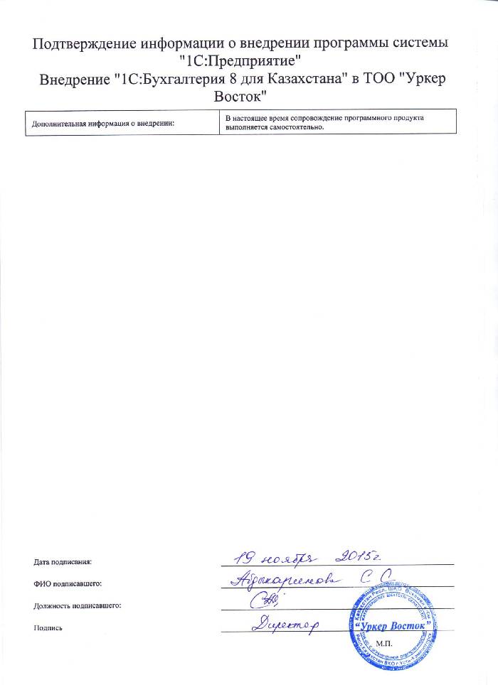 | Внедренное типовое решение: | 1С:Бухгалтерия 8 для Казахстана |