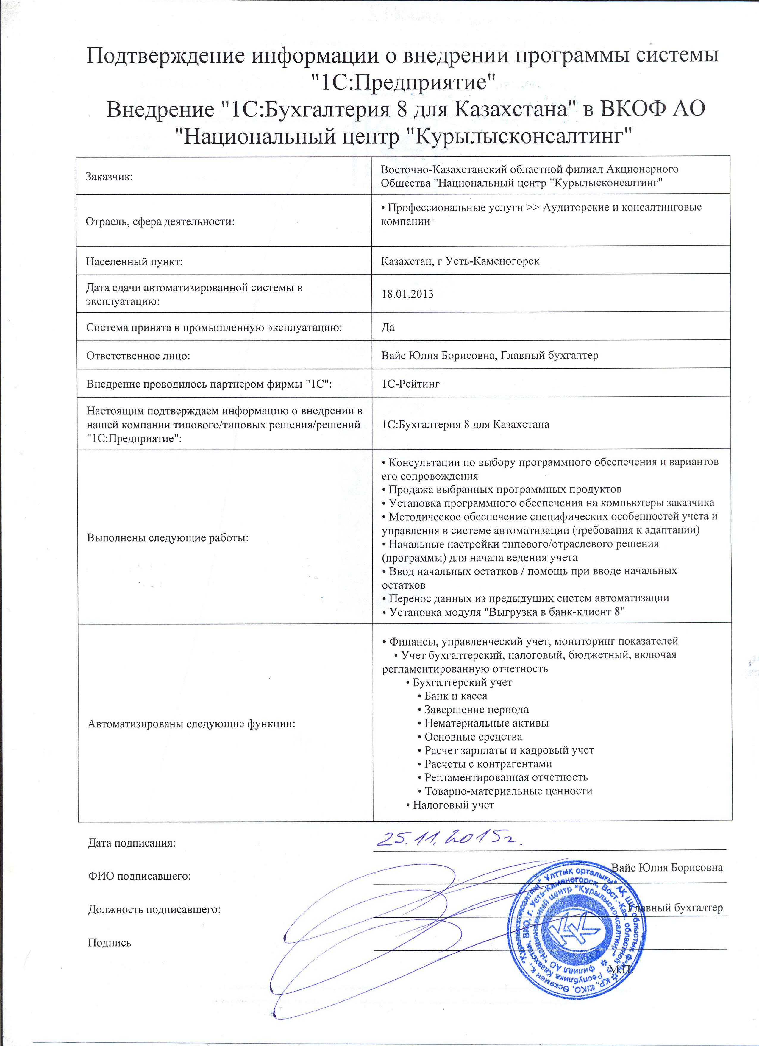 | Внедренное типовое решение: | 1С:Бухгалтерия 8 для Казахстана |