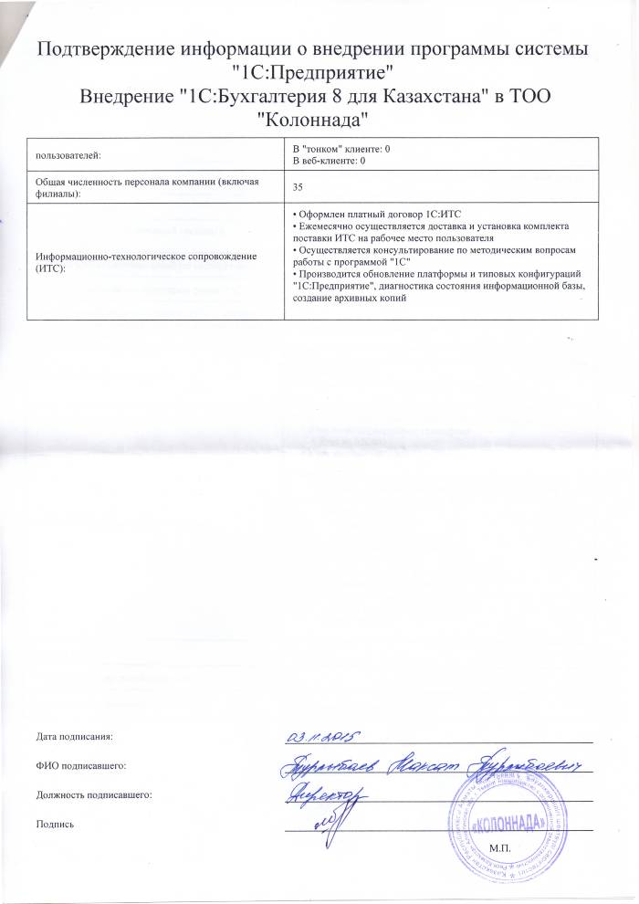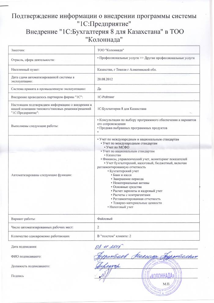 | Внедренное типовое решение: | 1С:Бухгалтерия 8 для Казахстана |