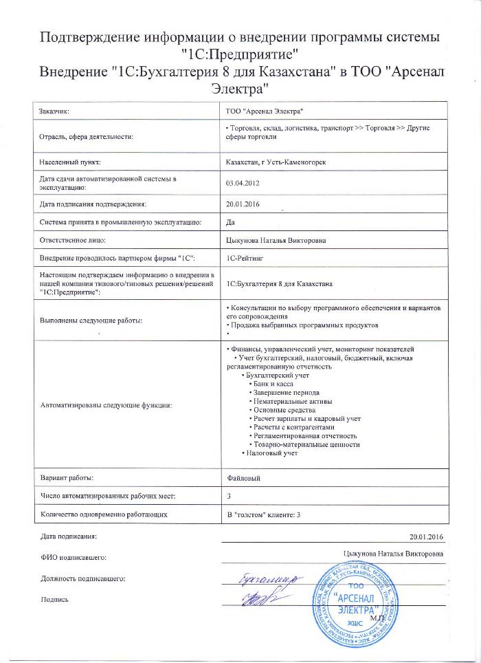 | Внедренное типовое решение: | 1С:Бухгалтерия 8 для Казахстана |