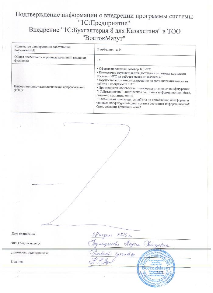 | Внедренное типовое решение: | 1С:Бухгалтерия 8 для Казахстана |