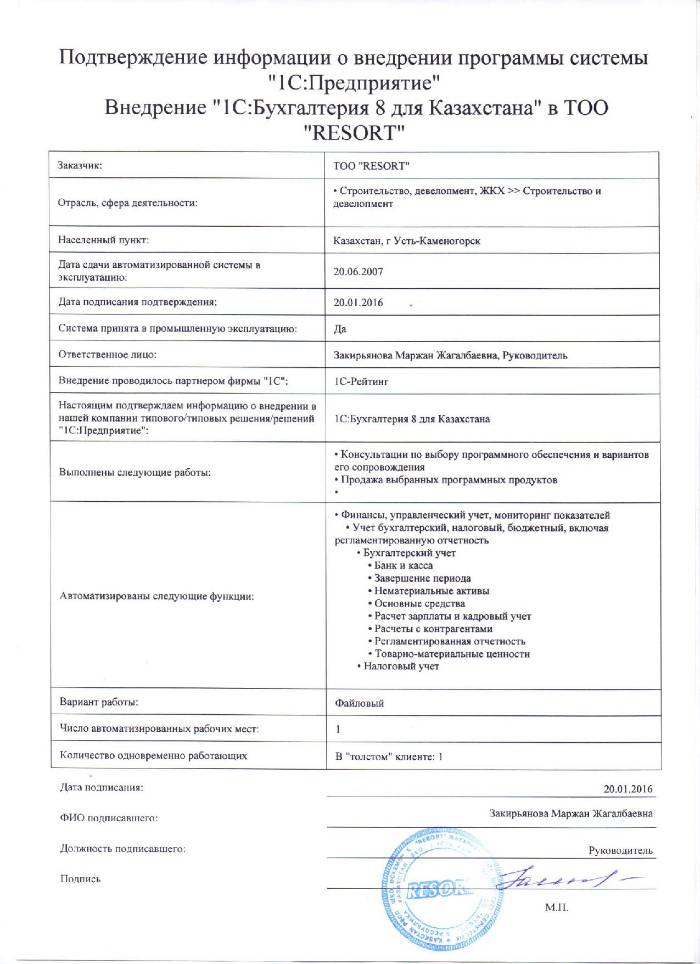 | Внедренное типовое решение: | 1С:Бухгалтерия 8 для Казахстана |