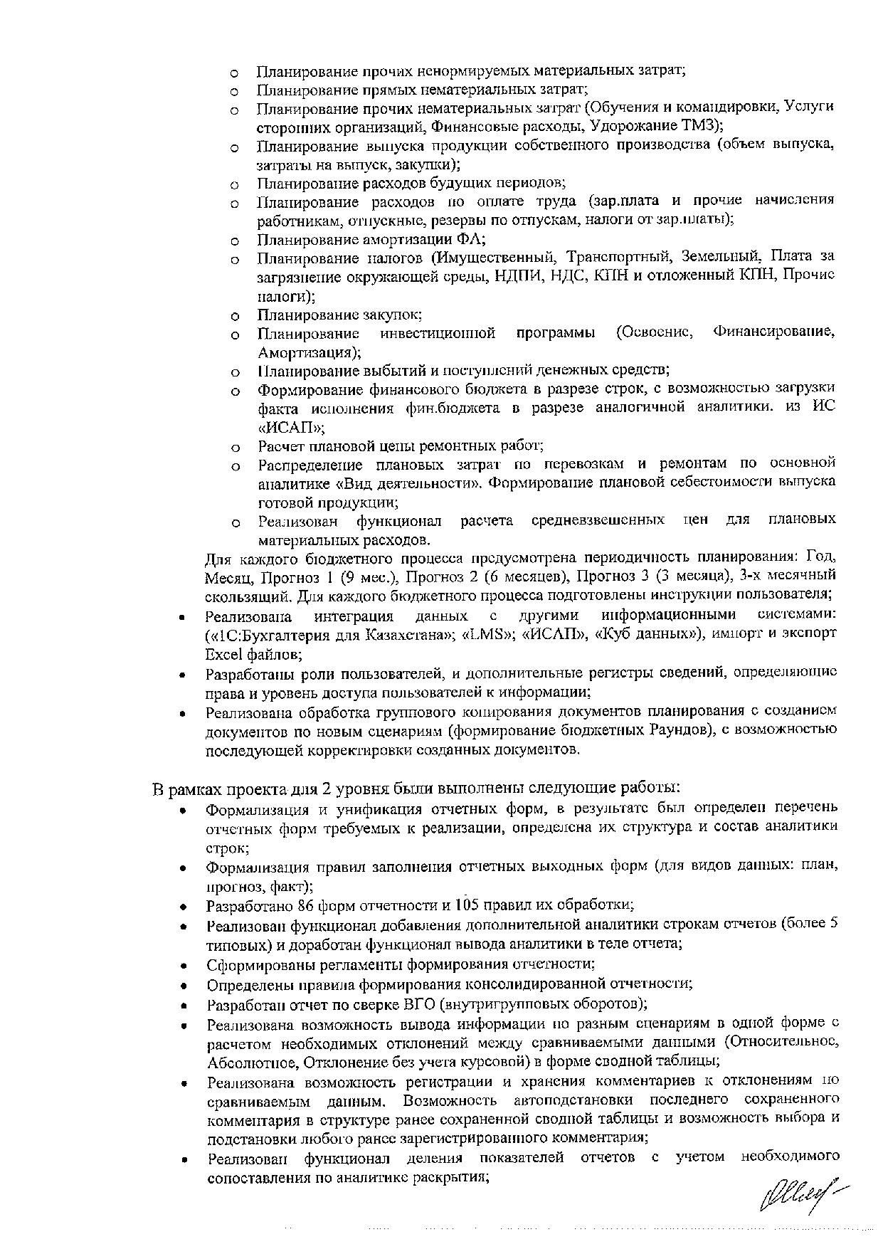 Подсистема планирования доходов, затрат, закупок и движения денежных средств подразделениями инициаторами на уровне учетной системы «1С:Бухгалтерия для Казахстана» (1 уровень) - включает в себя функции, связанные с обеспечением расчета по разработанной методике и отражения плановых и прогнозных сумм по доходам, расходам, закупкам и движению денежных средств используемых в последующем для формирования отчетных форм в «1С:Консолидация».