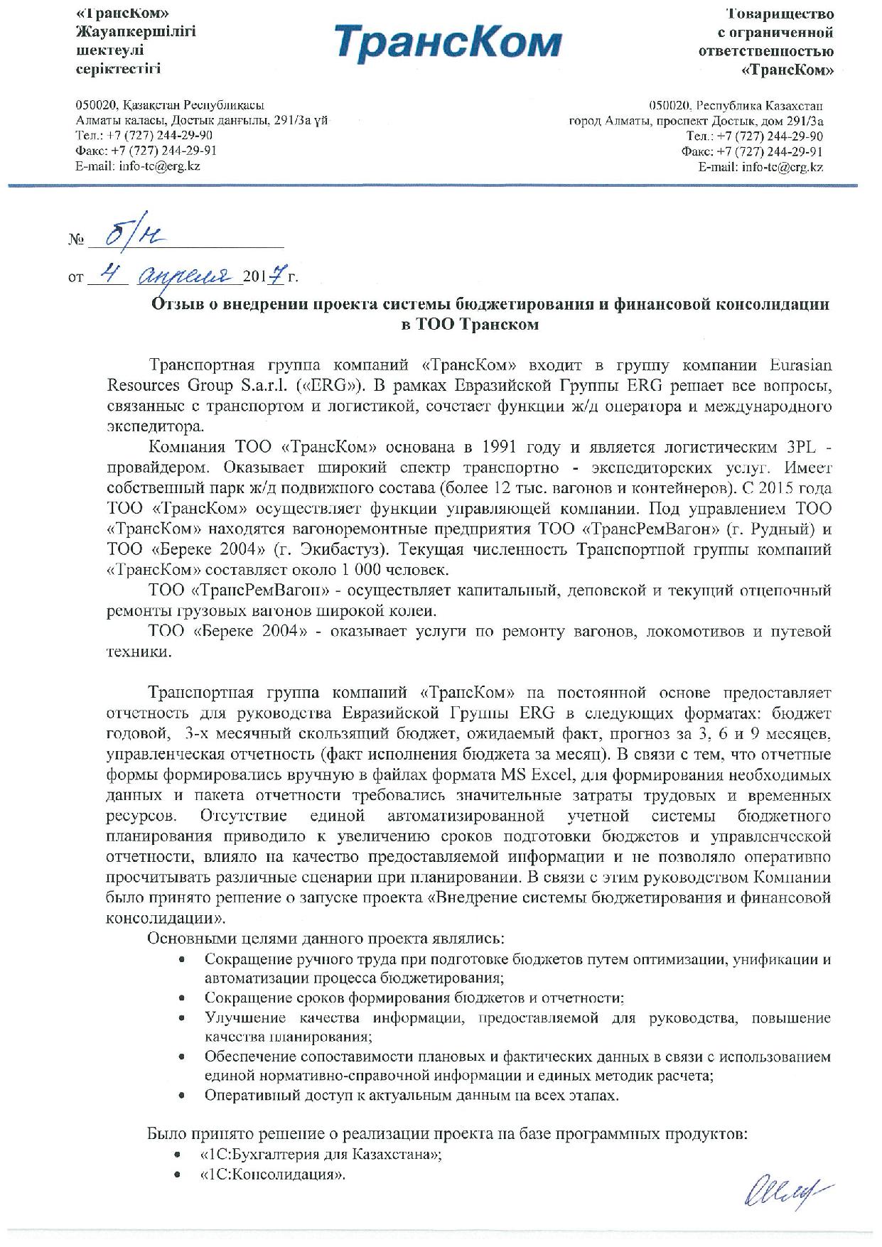Группа компаний «ТрансКом» на постоянной основе предоставляют отчетность для руководства холдинга в разрезе следующих видов данных: бюджет годовой, 3-х месячный скользящий бюджет выносимый на защиту, ожидаемый факт, прогноз за 3, 6 и 9 месяцев, управленческая отчетность (факт исполнения бюджета за месяц). Т.к. в текущей учетной системе «1С:Бухгалтерия для Казахстана» отсутствовала необходимая информация, отчетные формы формировались вручную в файлах формата MS Excel. Таким образом, для формирования необходимых бюджетных данных и пакета отчетности требовались значительные затраты трудовых ресурсов. Отсутствие единой учетной системы бюджетного планирования не позволяло формализовать и унифицировать бюджетные процессы, что в свою очередь оказывало влияние на качество бюджетного управления. В связи с этим руководством Компании было принято решение о запуске проекта «Внедрение системы бюджетирования и финансовой консолидации».