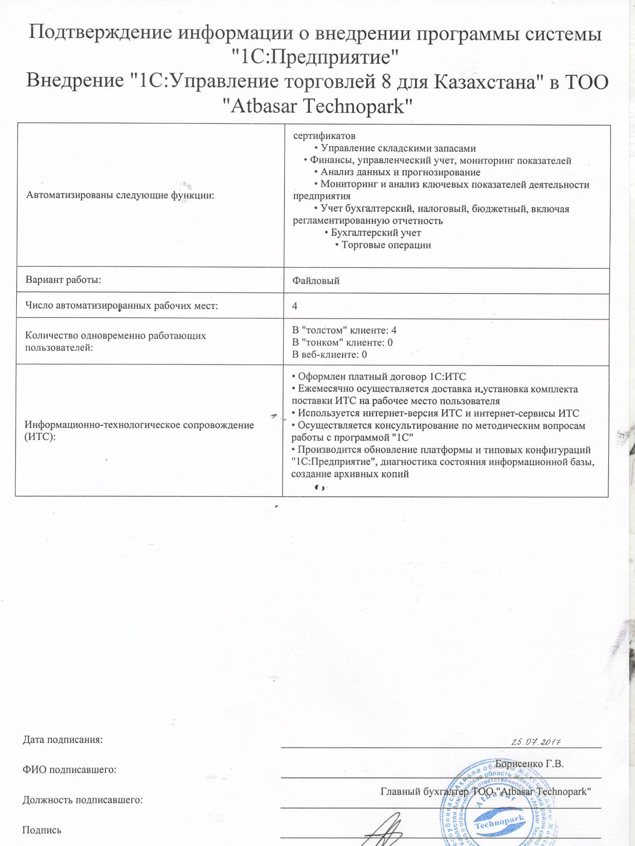 - Оформлен платный договор 1С:ИТС